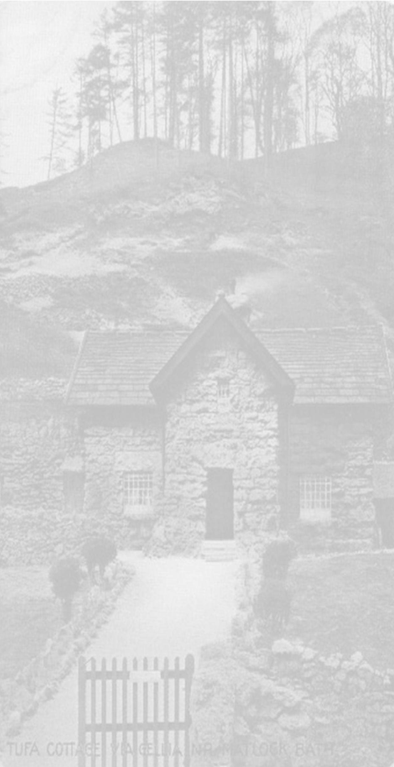 Nestling in the Via Gellia valley, Bonsall, in the picturesque county of Derbyshire, Tufa Cottage was built around 1830 as a gamekeeper's cottage for the Gell Estate. Constructed from tufa it is said to be the only house in the UK built from this rock. Only found in a limited number of locations in the UK, tufa is calcified moss that has grown on volcanic lava. On some of the early photographs that follow, the source of the rock can be seen behind the house. Appearing in many guide and history books and also on TV in The Heart of the Country, Tufa Cottage is a well known landmark even if you ignore the appearance in Haunted Houses of Derbyshire! Its sinister appearance, especially on a moonlit night, has been frightening local children for years, not helped by the association of the Via Gellia woods at the back of the house with black magic and witchcraft. We are happy to be able to say though that the woman with a large knife sticking out of her back seems to have moved on to pastures new...probably!
